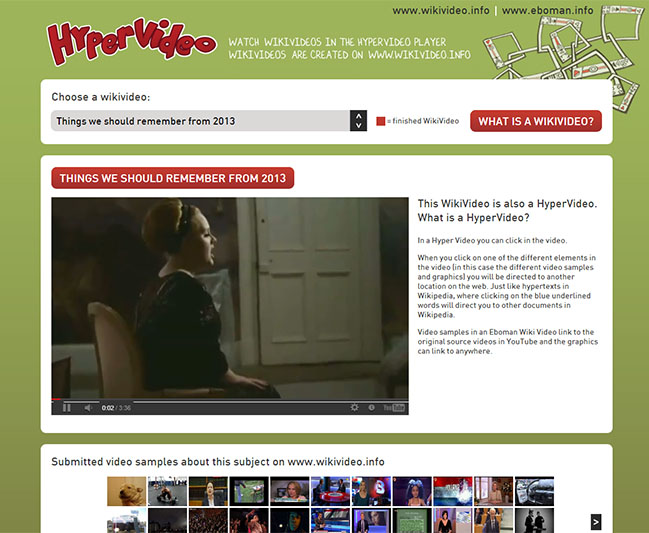 Wikivideo is het crowdsource based online video platform van kunstenaar Eboman. Het platform geeft de mogelijkheid aan iedereen om samen met eboman interactieve sample videos te creëren. Het relevante deel van een youtube filmpje wordt met de videosampler uit het origineel geknipt, klaar voor verwerking door Eboman!